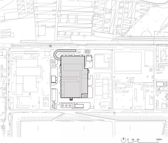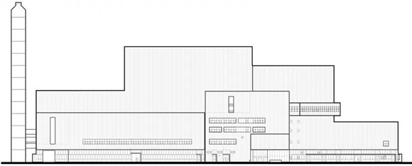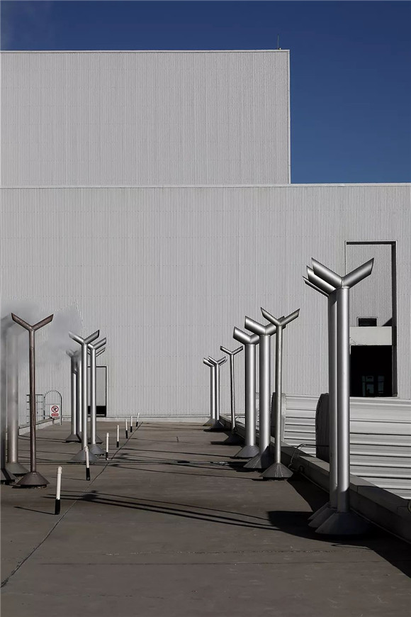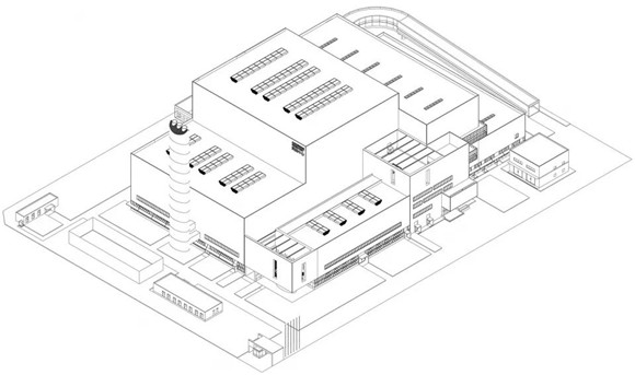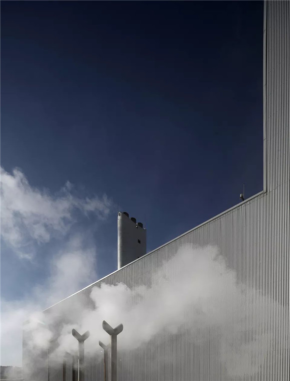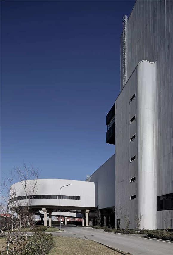 垃圾是人類城市生活的必然產(chǎn)物,垃圾處理中心也成為城市重要的市政公用設施。焚燒中心主廠房是廠區(qū)內體量及高度最大的建筑單體和核心建筑,通過對內部工藝和外部圍護系統(tǒng)的整合設計,建筑體量滿足設備工藝對空間的要求,使建筑作為一個整體,將垃圾運卸、存放、焚燒、凈化、發(fā)電的工藝流程及空間特征表達出來,并在保證工藝要求和使用功能的前提下,強調建筑體量的完整性和工業(yè)建筑的力量感、尺度感,選用能夠反映工業(yè)建筑特征的立面建材,形成簡潔、樸素、高效、不過分夸張喧鬧的外觀,展示其獨有的建筑形象,在“方整”的基本形態(tài)基礎上,在建筑轉角、主要出入口、屋頂?shù)任恢眠M行了體量的細化處理。