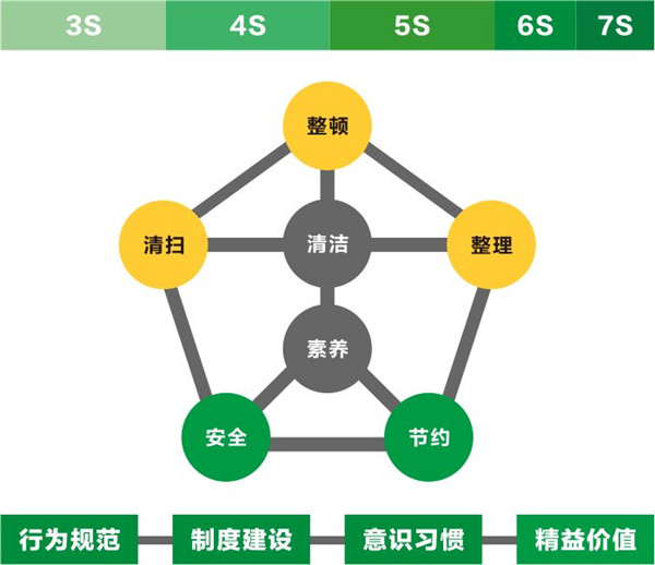 7S的在企業(yè)推行,從現(xiàn)場的定置定位和員工的行為規(guī)范開始,然后通過制度建設(shè)持之以恒,使員工慢慢形成意識,養(yǎng)成良好的工作習慣,最后成為企業(yè)的文化,產(chǎn)生核心的文化軟實力。立正顧問機構(gòu)認為,這是一個從現(xiàn)場改變到氛圍改變,最后到文化改變的過程。