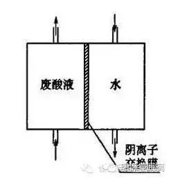 膜是有選擇透過性的,它不會讓每種離子以均等的機(jī)會通過。首先陰離子膜骨架本身帶正電荷,在溶液中具有吸引帶負(fù)電水化離子而排斥帶正電荷水化離子的特性,故在濃度差的作用下,廢酸側(cè)的陰離子被吸引而順利地透過膜孔道進(jìn)入水的一側(cè)。同時(shí)根據(jù)電中性要求,也會夾帶帶正電荷的離子,由于H+的水化半徑比較小,電荷較少;而金屬鹽的水化離子半徑較大,又是高價(jià)的,因此H+會優(yōu)先通過膜,這樣廢液中的酸就會被分離出來。