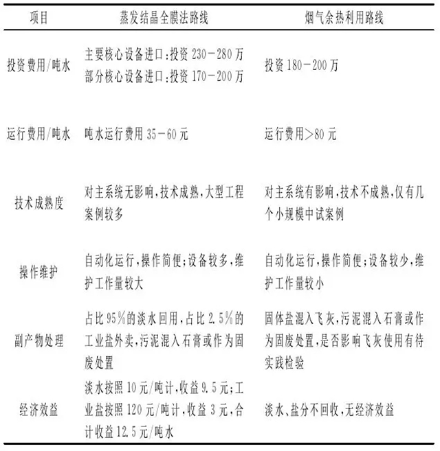 蒸發(fā)結晶全膜法工藝路線與煙氣余熱利用工藝路線比選。煙氣余熱利用廢水零排放是近來比較熱的技術,經常拿來跟蒸發(fā)結晶式零排放工藝相提并論,但它不能實現(xiàn)水資源和鹽資源的回收和再利用。2種工藝路線比較結果,見表2。