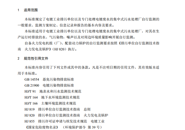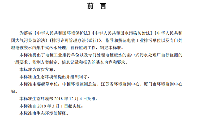 為落實《中華人民共和國環(huán)境保護法》《中華人民共和國水污染防治法》《中華人民共和國大氣污染防治法》《排污許可管理辦法(試行)》,指導和規(guī)范電鍍工業(yè)排污單位以及專門處理電鍍廢水的集中式污水處理廠自行監(jiān)測工作,制定本標準。本標準提出了電鍍工業(yè)排污單位以及專門處理電鍍廢水的集中式污水處理廠自行監(jiān)測的一般要求、監(jiān)測方案制定、信息記錄和報告的基本內(nèi)容和要求。本標準為首次發(fā)布。