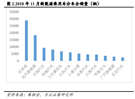 11 月中汽協(xié)數(shù)據(jù)公布,新能源汽車產(chǎn)銷量分別為17.3 萬(wàn)輛和16.9 萬(wàn)輛,同比增長(zhǎng)分別為 36.9%和 37.6%。新能源乘用車銷量為 14 萬(wàn)輛,其中純電動(dòng)乘用車 10.9 萬(wàn)輛,插電式混合動(dòng)力乘用車 3.1 萬(wàn)輛;新能源商用車的銷量為 3 萬(wàn)輛,純電動(dòng)商用車銷售 2.9 萬(wàn)輛。2018 年 1-11 月新能源汽車?yán)塾?jì)銷量 103 萬(wàn)輛,同比增長(zhǎng) 68%。