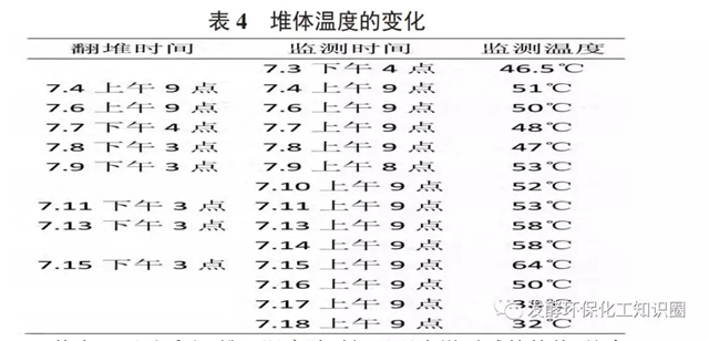 一般認(rèn)為高溫菌對(duì)有機(jī)物的降解效率高于中溫菌,但溫度過(guò)高,容易導(dǎo)致嗜熱菌的死亡,從而影響處理效果,高溫堆肥最高溫度一般控制在65℃以下。堆肥過(guò)程中堆體溫度變化見(jiàn)表4。