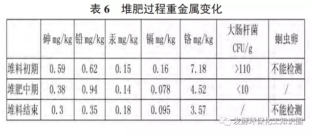 表6可以看出,砷、鉛、鎘、鉻的含量都降低了,說(shuō)明在堆肥過(guò)程中,大部分重金屬都得到鈍化,所以含量降低。但金屬汞的含量卻有所增加,這是因?yàn)樵诙逊蔬^(guò)程中水分和揮發(fā)性物質(zhì)損失,以及堆肥后堆體體積變小,引起該金屬在堆體中濃縮所致。