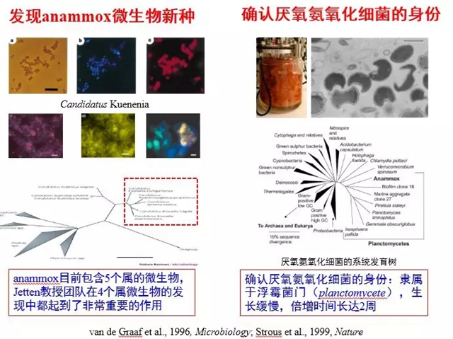 Anammox現(xiàn)象被發(fā)現(xiàn)之后,Kuenen教授的一位主要助手Mike Jetten博士專注于Anammox的微生物學(xué)研究,并在加盟荷蘭奈梅亨大學(xué)微生物系之后,組織團(tuán)隊展開了長期的基礎(chǔ)研究工作,發(fā)現(xiàn)和培養(yǎng)了新的參與氮、硫和碳轉(zhuǎn)化的微生物,采用分子生物學(xué)、結(jié)構(gòu)化學(xué)和宏基因組學(xué)從基因、細(xì)胞、個體和生態(tài)系統(tǒng)水平揭示相關(guān)微生物的反應(yīng)機理。