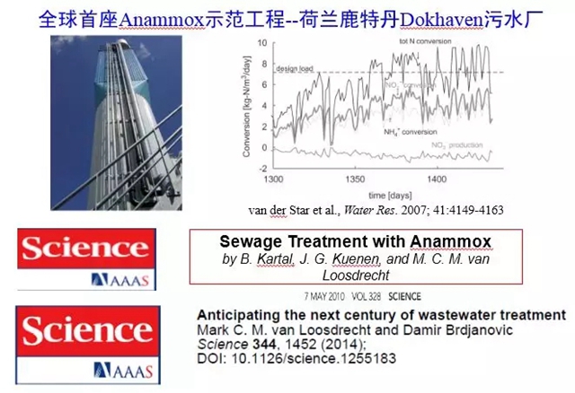 Kuenen教授的另一位主要助手Mark van Loosdrecht教授則在Anammox的實際應(yīng)用方面有很大的貢獻(xiàn)。他利用數(shù)學(xué)模型作為研究工具,并在公司的協(xié)助下,建立了全球第一座Anammox示范工程——荷蘭鹿特丹Dokhaven污水廠。他在2007年和2014年在《Science》上發(fā)表了關(guān)于厭氧氨氧化方面的文章。