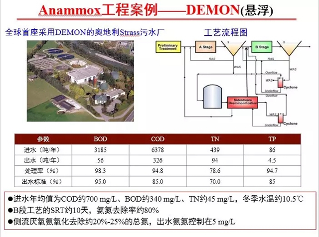 奧地利Strass污水處理廠是全球首座采用DEMON的污水廠。污泥消化液的厭氧氨氧化主要有兩個方面的核心技術(shù):一是基于pH的DO實時控制短程硝化,另一個是基于物理分離技術(shù)實現(xiàn)雙泥齡,采用旋流分離器(DEMON1.0),后改進(jìn)為微篩選擇器(DEMON2.0)。Strass污水廠目前在厭氧氨氧化做的非常成功,氨氮去除率約80%,總氮去除率20%-25%,出水氨氮控制在5mg/L以下。目前這種工藝在美國、德國、瑞士等也都做的非常好。