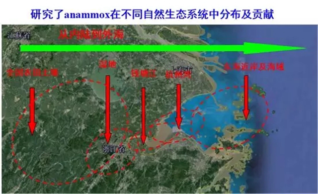 鄭平教授以前的學(xué)生--浙江大學(xué)胡寶蘭教授研究了Anammox細(xì)菌在中國不同自然生態(tài)系統(tǒng)中的分布及貢獻(xiàn)。她發(fā)現(xiàn),Anammox細(xì)菌廣泛存在于不同的自然生境中,且沉積物的有機碳和無機氮是影響Anammox分布的主要因素。她還發(fā)現(xiàn)人類活動影響了Anammox菌的分布,甚至特定Anammox菌可作為人類活動的指示菌。