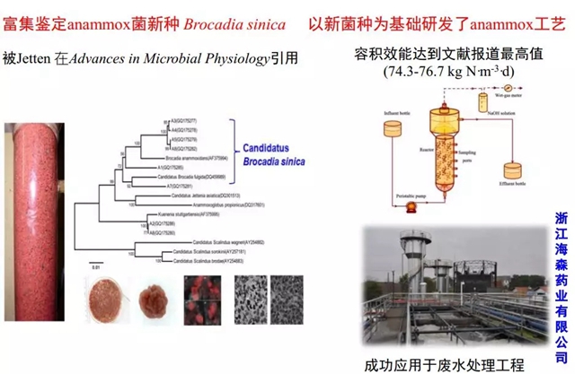 鄭平教授團(tuán)隊改進(jìn)的Anammox工藝容積效能達(dá)到文獻(xiàn)報道最高值(74.3~76.7kg N·m-3·d),并成功應(yīng)用于浙江的海森藥業(yè)有限公司廢水處理工程,這是中國第一個厭氧氨氧化廢水處理的實際工程。