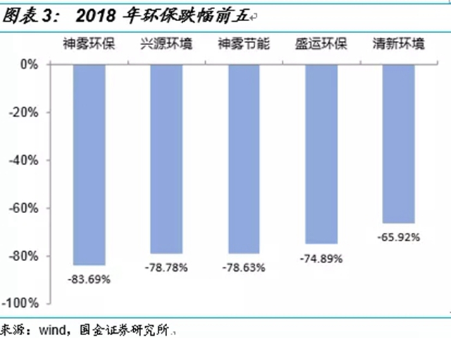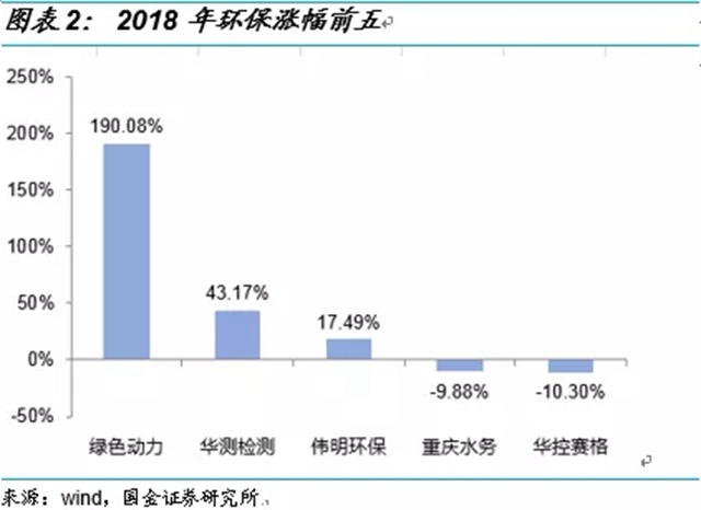 2018年A股中的環(huán)保股,漲幅前五的分別是綠色動力(+190.08%,新股)、華測檢測(+43.17%)、偉明環(huán)保(+17.49%)、重慶水務(-9.88%)和華控賽格(-10.30%);跌幅前五的分別是神霧環(huán)保(-83.69%)、興源環(huán)境(-78.78%)、神霧節(jié)能(-78.63%)、盛運環(huán)保(-74.89%)和清新環(huán)境(-65.92%)。