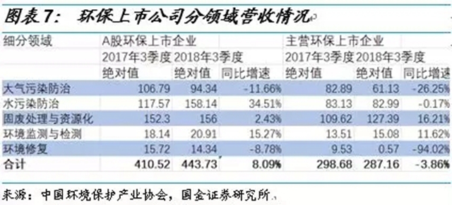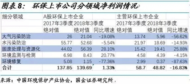 分領域來看,固廢處理與監(jiān)測行業(yè)業(yè)績表現(xiàn)相對較好。我們根據(jù)中國環(huán)境保護產(chǎn)業(yè)協(xié)會的統(tǒng)計,選取了主營業(yè)務涉及環(huán)保業(yè)務的A股環(huán)保上市公司120家,環(huán)保業(yè)務收入占主營業(yè)務收入比例大于50%的51家主營環(huán)保上市公司。主營環(huán)保上市公司中2018年3季度固廢處理與資源化、環(huán)境監(jiān)測與監(jiān)測業(yè)績表現(xiàn)較好,營收分別增長16.21%和11.62%,凈利潤分別增長25.88%和-4.15%;環(huán)境修復與大氣污染防治業(yè)績表現(xiàn)較差,營收分別下降94.02%和26.25%,凈利潤分別下滑87.63%和56.62%。