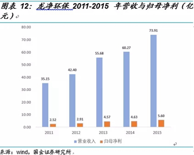 政策的大力支持帶動了火電脫硝機組的快速增長,全國煤電機組脫硝比重從2011年的9.80%快速增長到了2015年的95%。與此同時,脫硝機組的改造帶動了相應市場需求的快速釋放,從事大氣污染控制領域的上市公司龍凈環(huán)保的營業(yè)收入和歸母凈利從2011年的35.15億和2.52億,快速增長到了2015年的73.91億和5.60億,復合增長率分別達到了20.42%和22.10%。