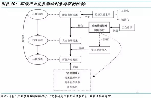 環(huán)保行業(yè)發(fā)展的核心邏輯在于環(huán)境問題的出現(xiàn)—環(huán)境問題的治理—環(huán)境質(zhì)量的改善,這一過程對應環(huán)保產(chǎn)業(yè)的成長,表現(xiàn)為潛在市場需求的產(chǎn)生—實際市場需求的形成—環(huán)保產(chǎn)業(yè)的發(fā)展??梢钥闯?,環(huán)保產(chǎn)業(yè)的成長邏輯也圍繞著市場需求的演變而展開。影響環(huán)保行業(yè)驅(qū)動因素作用于成長邏輯主線的各個環(huán)節(jié),主要有經(jīng)濟發(fā)展水平、政策法規(guī)標準的制定執(zhí)行、公眾意識、資本要素投入等四類。