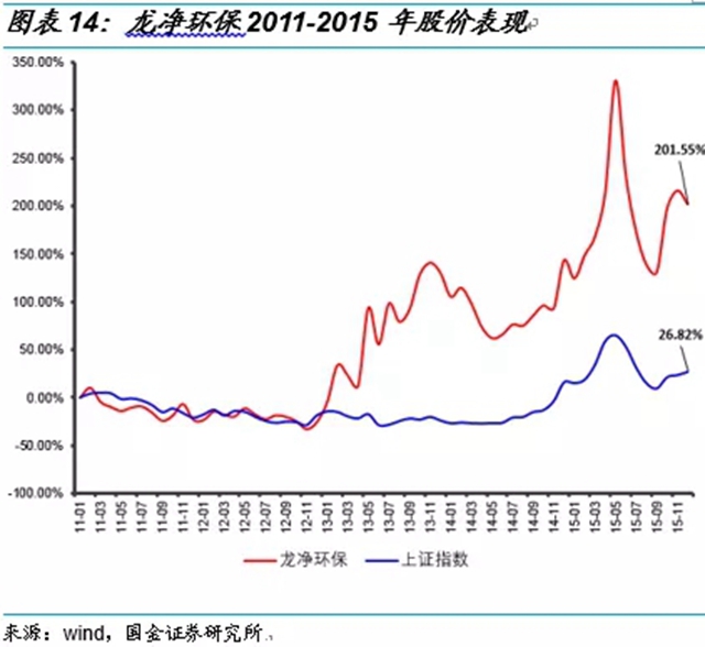 龍凈環(huán)保依靠其SCR煙氣脫硝技術將圓盤回旋混流技術與AIG氨噴射技術進行有機結合,可保證氨/煙氣混合更加均勻;氨氣流量調(diào)節(jié)采用氣動薄膜單座直通式調(diào)節(jié)閥組來實現(xiàn),具有線性調(diào)節(jié)性好、反應動作快、調(diào)節(jié)穩(wěn)定、密封性能好等優(yōu)點,既可保證高脫硝率,又能準確控制氨流量,保證氨逃逸率。采用該先進技術,可保證脫硝率達90%以上,氨逃逸<2.5ppm,SO2/SO3轉(zhuǎn)化率<1%。在2015年中電聯(lián)公布的簽訂合同的火電廠煙氣脫硝機組容量情況中,龍凈環(huán)保排名全國第二。隨著脫硝市場的快速釋放和業(yè)績的增加,公司股價從2011年初到2015年底上漲201.55%,跑贏上證指數(shù)175個百分點,公司市值也由2011年初的71.5億增加至2015年底的185億。