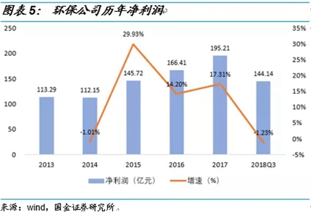 我們統(tǒng)計了環(huán)保(中信)指數(shù)包含的62家環(huán)保上市公司的營收與凈利潤情況,環(huán)保公司主營業(yè)務收入2013-2017年保持較高速度增長,且增速逐年提高,2017年達到1658億元,增速為26.87%。而2018年前三季度主營收入為1228億,增速明顯放緩至12.14%。與此同時,環(huán)保上市公司在2018年前三季度的凈利潤增長轉(zhuǎn)正為負,由2017年的17.31%降為-1.23%,前三季度凈利潤為144.14億。
