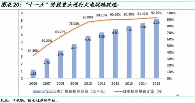 例如火電脫硫脫硝超低排放呈現(xiàn)階段性并進入了成熟期,在“十一五”期間重點進行全國煤電機組脫硫改造,全國煤電機組脫硫機組占比從2006年的34.80%快速提升至2010年的86%。“十二五”重點進行了煤電脫硝改造,全國煤電機組脫硝比重從2011年的9.80%快速增長到了2015年的95%。“十三五”期間重點進行了超低排放改造,截止2017年底,全國范圍內(nèi)超低排放改造目標任務完成率已達71%,東部地區(qū)已基本完成,部分中部地區(qū)省份也提前完成了改造任務,預計2020年全國將全部火電超低排放改造。