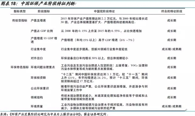 我國環(huán)保產(chǎn)業(yè)發(fā)展的大部分特點符合成長期的特征,個別領域已呈現(xiàn)成熟期特征,因此我國環(huán)保產(chǎn)業(yè)發(fā)展正處于成長期向成熟期的邁進的重要階段,但遠未進入拐點期,在可預見的中長期內(nèi)仍有較大的發(fā)展空間和潛力。