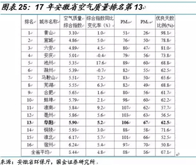 我們以阜陽市為例,2017年大氣污染防治工作考核不合格。2018年3月6日,安徽省政府辦公廳公布2017年度大氣污染防治工作考核結果。黃山市、合肥市為優(yōu)秀等次,池州市、阜陽市、淮南市、亳州市為不合格等次??己瞬缓细竦乃某鞘袑⒚媾R環(huán)評限批,即新增大氣污染物排放建設項目將被暫停審批。