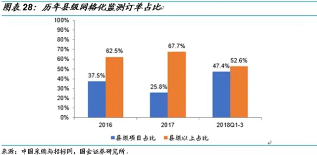 其他區(qū)域市場空間預測:肇慶市在2017年下半年已經(jīng)完成了第一期50個網(wǎng)點的建設,投資660萬元,第二期正在籌備之中。蘭州市已于2017年完成555套網(wǎng)格化監(jiān)測設備的安裝。我們預測未來三年將有20%的地級市(全國334個地級市減去重點區(qū)域80個城市),即50個城市安裝網(wǎng)格化監(jiān)測系統(tǒng),則對應的網(wǎng)格化設備市場空間為25億元,對應的運維市場空間為5億元。其他地區(qū)的縣及縣級市(不包括區(qū))數(shù)量為1272個,按照20%的地級市安裝網(wǎng)格化監(jiān)測系統(tǒng)計算,則設備投入為38億,運營投入為10億/年。綜上我們預計未來三年其他區(qū)域的設備市場空間為63億,運營市場空間為15億/年。