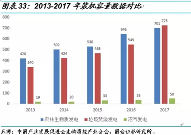 2017 年,垃圾焚燒發(fā)電裝機容量達725.1萬千瓦,較上年增長32.1%;農(nóng)林生物質(zhì)發(fā)電裝機容量達700.77萬千瓦,較上年增長8.4%;沼氣發(fā)電裝機容量達49.9萬千瓦,較上年增長42.9%。2017 年,垃圾焚燒發(fā)電裝機容量增長速度快于農(nóng)林生物質(zhì)裝機容量增速,垃圾發(fā)電裝機容量5 年內(nèi)首次超過農(nóng)林生物質(zhì)發(fā)電裝機容量。