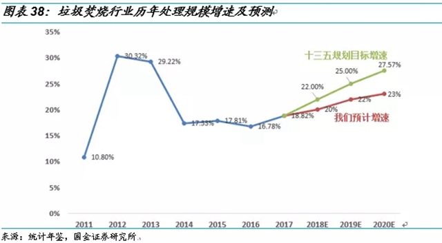 其次,雖然我國垃圾焚燒處理率提高迅速,但跟規(guī)劃仍有較大差距。我國的垃圾焚燒行業(yè)在“十二五”經(jīng)歷了快速增長,垃圾焚燒處理率從2011年的18%迅速提升到了2016年的38%?!?ldquo;十三五”全國城鎮(zhèn)生活垃圾無害化處理設施建設規(guī)劃》提出,“十三五”期間,全國規(guī)劃新增生活垃圾無害化處理能力50.97萬噸/日(包含“十二五”續(xù)建12.9 萬噸/日),其中垃圾焚燒處理設施規(guī)模2020年要達到59.14萬噸/日。2017年的總處理能力達到30.4萬噸/日,要完成2020年的目標,2018-2020三年的行業(yè)復合增長率要達到24.83%。根據(jù)行業(yè)歷年增速及現(xiàn)有公司在建及籌建規(guī)模,我們預計2018-2020年行業(yè)增速分別是20%、22%和23%。