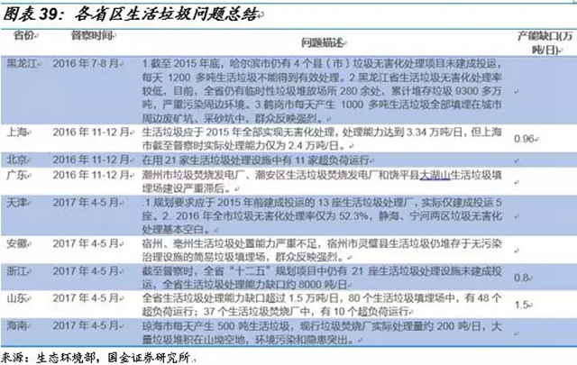 最后,我們通過生態(tài)環(huán)境部網(wǎng)站中的2016年到2017年的中央環(huán)保督察對全國31省區(qū)的督察反饋中發(fā)現(xiàn),垃圾焚燒產(chǎn)能的缺口確實存在且巨大。在31個省區(qū)中,其中有9個省區(qū)被督察到有生活垃圾無害化能力不足的問題。例如:浙江省督察時發(fā)現(xiàn)全省“十二五”規(guī)劃項目中仍有21座生活垃圾處理設施未建成投運,全省生活垃圾處理能力缺口約8000噸/日;山東省全省生活垃圾處理能力缺口超過1.5萬噸/日,80個生活垃圾填埋場中,有48個超負荷運行。