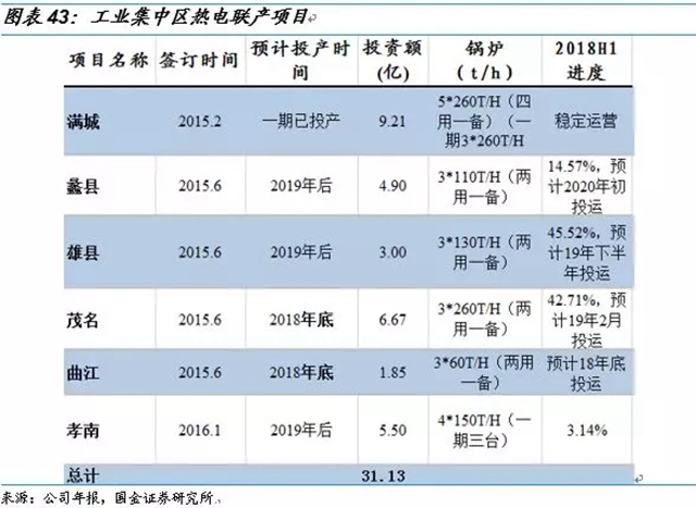 工業(yè)集中區(qū)熱電聯(lián)產(chǎn)業(yè)務方面,除了滿城熱電項目,公司還有其他5個項目。截至2018年6月底,雄縣、蠡縣項目進展有所突破,將為雄安新區(qū)的基礎配套設施建設、為保定地區(qū)的大氣治理和節(jié)能減排作出貢獻;茂名、曲江項目建設已接近尾聲,預計曲江項目于今年年底投運,茂名項目19年初投運。