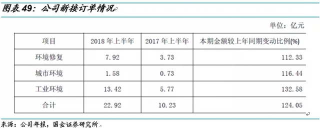 今年以來,公司項目拓展速度明顯加速,上半年公司三大業(yè)務板塊環(huán)境修復、城市環(huán)境和工業(yè)環(huán)境的新增訂單增速分別是112%、116%和133%,總金額達到了22.92億元。18年上半年,公司環(huán)境修復板塊實現(xiàn)收入4.28億元,同比增長64.29%。