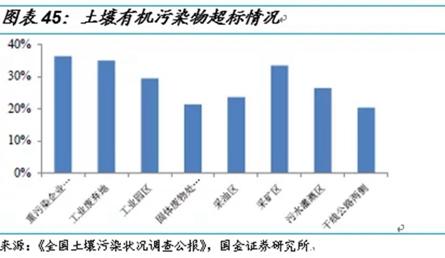 除了耕地污染,我國場地污染情況也很嚴重。全國土壤污染狀況調(diào)研公報中,重污染企業(yè)、工業(yè)廢棄地和工業(yè)園區(qū)的有機污染超標均達到和超過了30%。隨著我國城鎮(zhèn)化率的提高和城市建設面積的擴大,很多重污染企業(yè)需要搬離城區(qū),這將產(chǎn)生很大的場地修復需求。