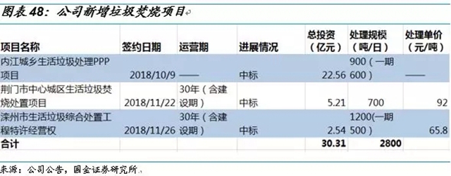 固廢處理在手項目充足,未來業(yè)績增長有保障。公司固廢處理業(yè)務板塊已經(jīng)投運產(chǎn)能11300噸/日,在建及籌建產(chǎn)能約為16000噸/日,在手項目充足,未來產(chǎn)能還有翻倍的空間。我們預計2019年將投產(chǎn)3700噸/日,2020年將投產(chǎn)3000噸/日以上。11月21日,公司以3.7億元收購贛州宏華環(huán)保有限責任公司100%股權,并投資贛州信豐工業(yè)固體廢物處置中心項目。信豐項目危險廢物處置規(guī)模為7.2萬噸/年,其中填埋4.8萬噸/年、焚燒1.5萬噸/年、物化處理0.2萬噸/年、廢鋼制包裝桶回收0.7萬噸/年,安全填埋場總庫容95萬m³,預計于18年12月底正式投入運營。公司原有危廢處置項目為佛山市南海區(qū)項目(9.3萬噸/年),目前在建中。通過收購宏華環(huán)保100%股權,公司危廢處置規(guī)模達到16.5萬噸。此次收購有利于實現(xiàn)公司的危廢業(yè)務戰(zhàn)略布局,符合公司戰(zhàn)略投資方向和業(yè)務發(fā)展規(guī)劃,將為公司創(chuàng)造新的利潤增長點。