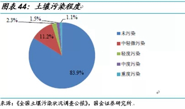 根據(jù)國土資源部數(shù)據(jù),最新全國耕地面積為 20.27 億畝。全國土壤污染狀況調(diào)查公報中,全國土壤總的超標率為 16.1%;耕地土壤點位超標率為 19.4%,其中輕微、輕度、中度和重度污染點位比例分別為 13.7%、 2.8%、 1.8%和 1.1%,其中重度、中度污染耕地區(qū)域面積高達 5878 萬畝。