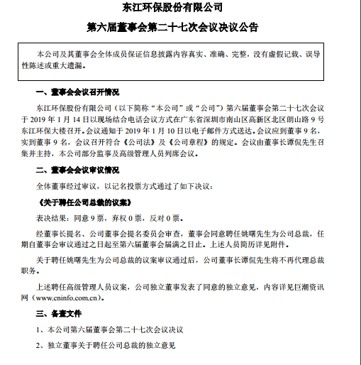東江環(huán)保公告,經(jīng)董事長提名、公司董事會提名委員會審查,董事會同意聘任姚曙為公司總裁,任期自董事會審議通過之日起至第六屆董事會屆滿之日止。關于聘任姚曙為公司總裁的議案審議通過后,公司董事長譚侃將不再代理總裁職務。