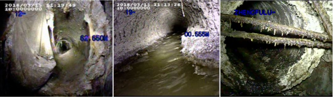 這幾張就是在剛才那個冒出很多污水的農(nóng)貿(mào)市場下面拍的。最左邊這種叫沉積和堵塞,這么大的井口縮成了這么點(diǎn)。第二個是鋼筋混凝土的腐蝕,就像我們的血管被腐蝕了。第三個是建筑垃圾,有時會損壞管道,形成穿刺。