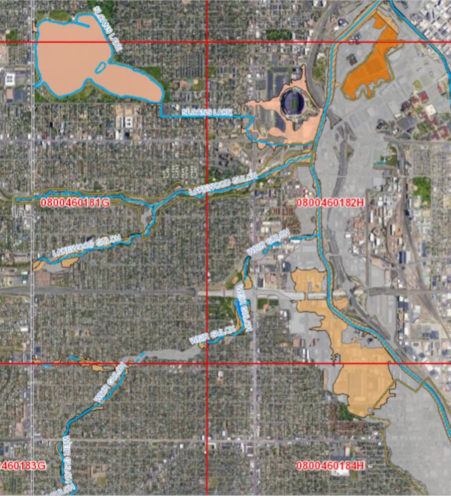 我們從其他地方看到了一些做法,其實(shí)是基于洪澇風(fēng)險圖很普遍的做法。這個是美國丹佛。這個圖里灰色區(qū)域是特大暴雨才會淹到的位置,粉色的是比如二十、五十年一遇會淹到的位置。藍(lán)色的線條就是要大家保護(hù)住的地方,這里能夠讓水通過,一定會要保留它的通道。