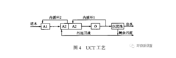 在常規(guī)A2/O工藝中,由于厭氧區(qū)在前,回流污泥不可避免地將一部分硝酸鹽帶入該區(qū)。硝酸鹽的存在嚴(yán)重影響了聚磷蓖的釋磷效率,尤其當(dāng)進(jìn)水中VFA較少,污泥的含磷量又不高時,硝酸鹽的存在甚至?xí)?dǎo)致聚磷菌直接吸磷。所以在常規(guī)A2/O工藝框架下,如何避免硝酸鹽進(jìn)入?yún)捬鯀^(qū)干擾釋磷一度成為研究熱點,并圍繞這一問題產(chǎn)生了諸如UCT工藝,JHB工藝,EASC工藝等,其中最著名的應(yīng)屬UCT工藝(如圖4) 。