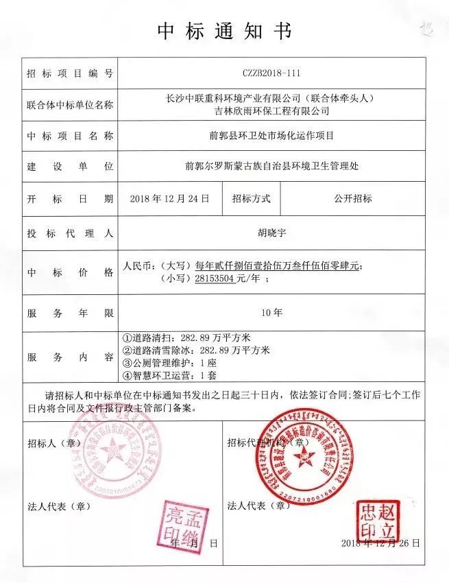 2018年12月24日,中聯(lián)環(huán)境中標前郭縣環(huán)衛(wèi)處市場化運作項目,總合同額2.82億,運營期限10年,單年度服務費2815.35萬。主要運營內容覆蓋道路清掃、道路清雪除冰、公共設施管理維護及智慧環(huán)衛(wèi)運營等,其中維護道路面積達282.89萬平方米。