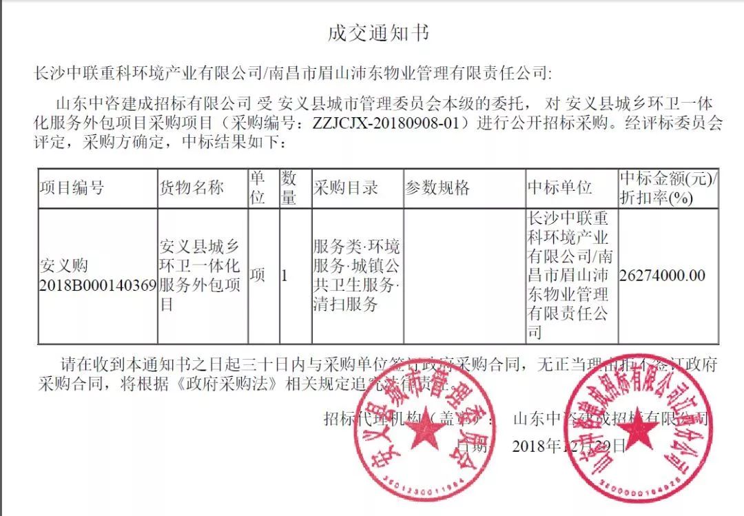 2018年12月29日,中聯(lián)環(huán)境成功中標江西省安義縣城鄉(xiāng)環(huán)衛(wèi)一體化服務項目,中標總金額約為2.38億元,服務期限5+3年,單年度服務費2627.4萬元。