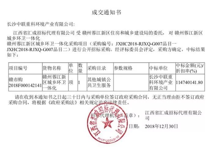 2018年12月30日,中聯(lián)環(huán)境成功中標贛州蓉江新區(qū)城鄉(xiāng)環(huán)衛(wèi)一體化二標段項目,該項目分兩期實施,首期當年服務費約2300萬,服務期限5+3年,全生命周期總額約為3.8億元。