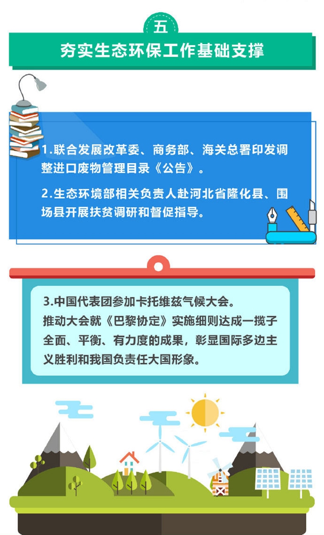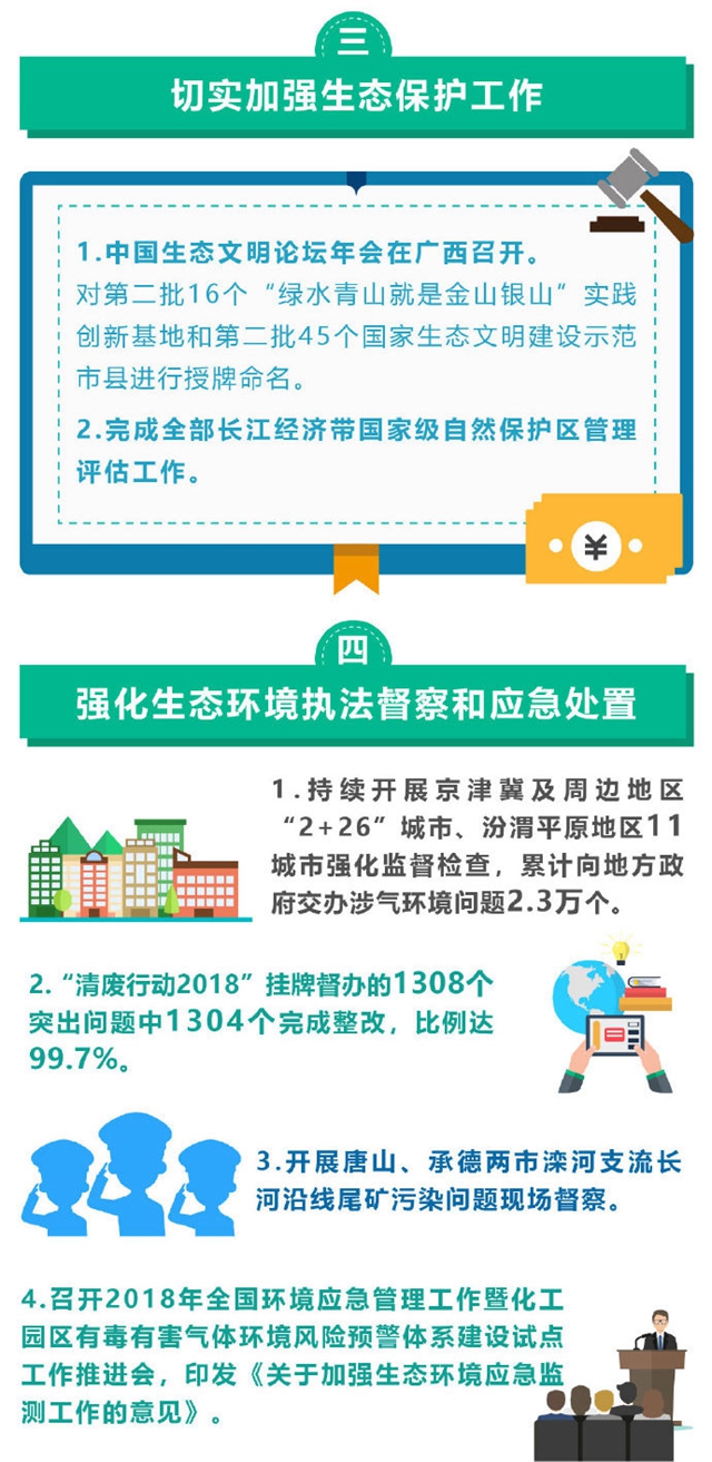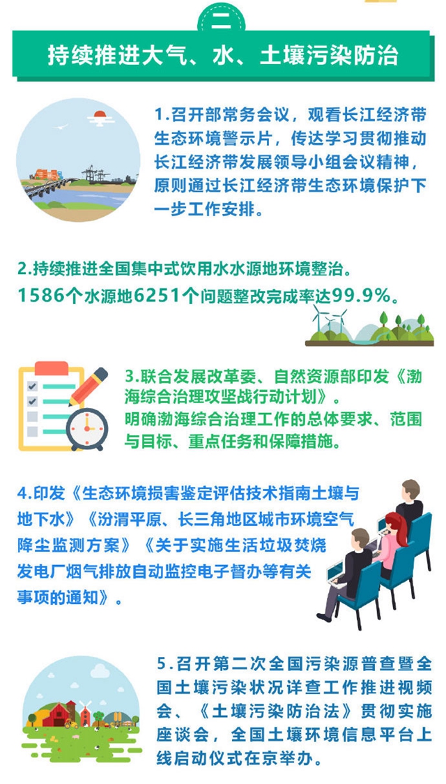 例如:召開全面從嚴(yán)治黨第一次專題會議,研究近年來生態(tài)環(huán)境部貫徹落實中央八項規(guī)定精神情況;持續(xù)推進全國集中式飲用水水源地環(huán)境整治;印發(fā)《生態(tài)環(huán)境損害鑒定評估技術(shù)指南土壤與地下水》《汾渭平原、長三角地區(qū)城市環(huán)境空氣降塵監(jiān)測方案》;召開第二次全國污染源普查暨全國土壤污染狀況詳查工作推進視頻會;完成全部長江經(jīng)濟帶國家級自然保護區(qū)管理評估工作;“清廢行動2018”掛牌督辦的1308個突出問題中1304個完成整改,比例達到99.7%等等。