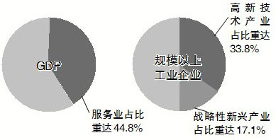 服務(wù)業(yè)占GDP比重達(dá)45.8%,高新技術(shù)產(chǎn)業(yè)、戰(zhàn)略性新興產(chǎn)業(yè)增加值占規(guī)上工業(yè)比重分別達(dá)35%、18.5%左右;單位GDP能耗下降1%,單位二氧化碳排放量下降2.5%,萬元GDP用水量下降5.3%。