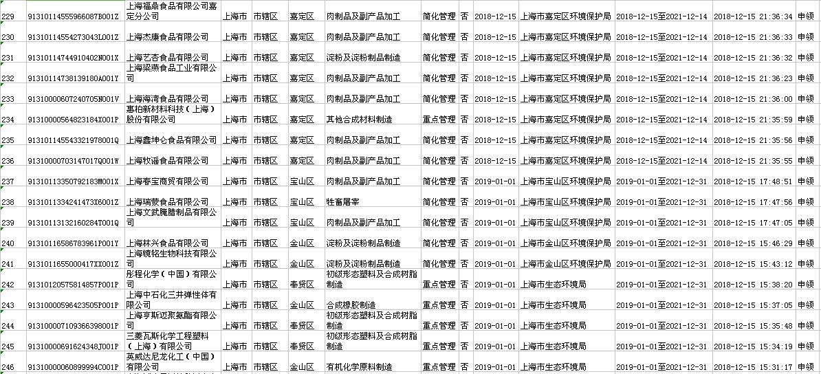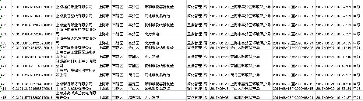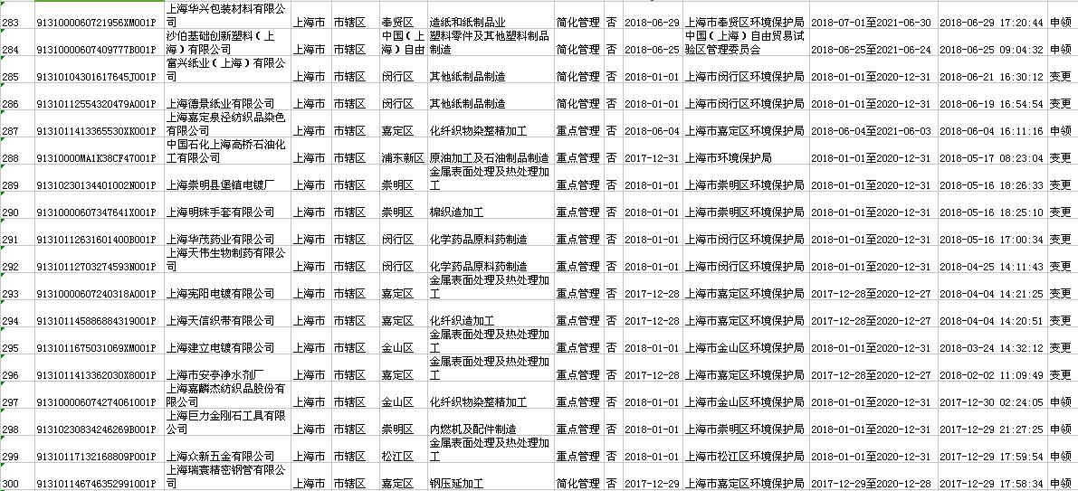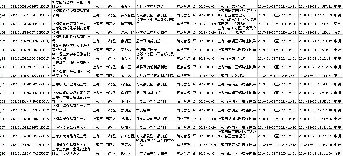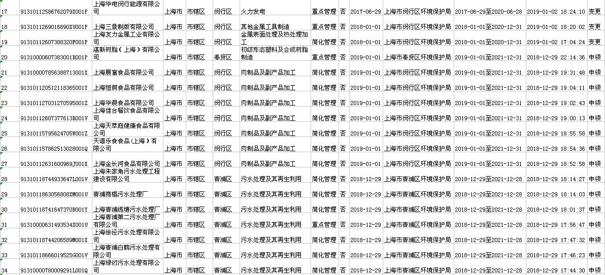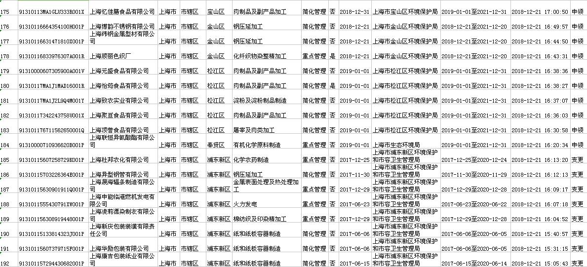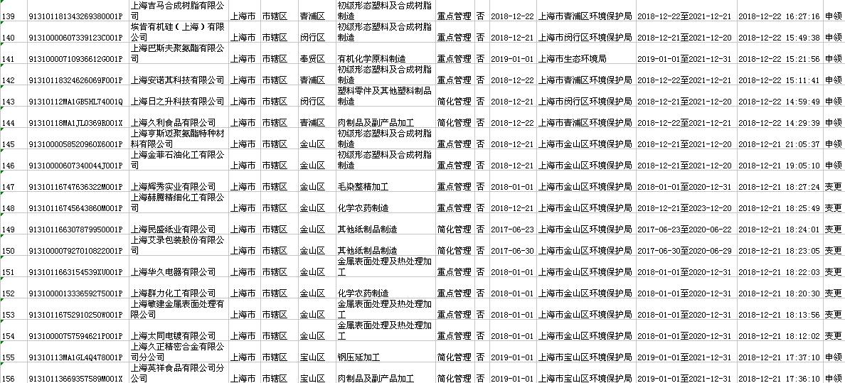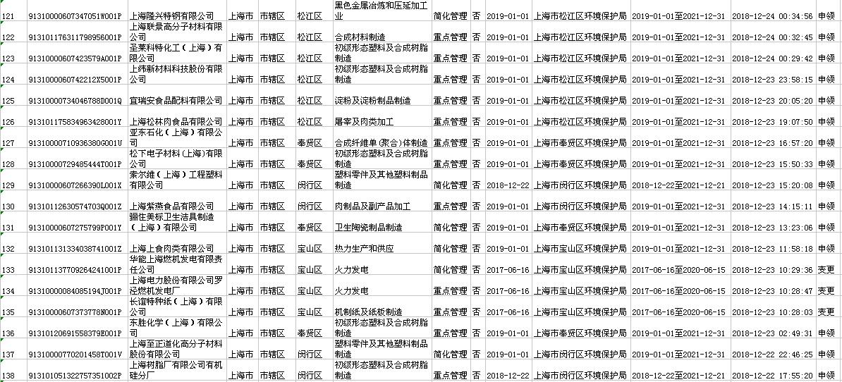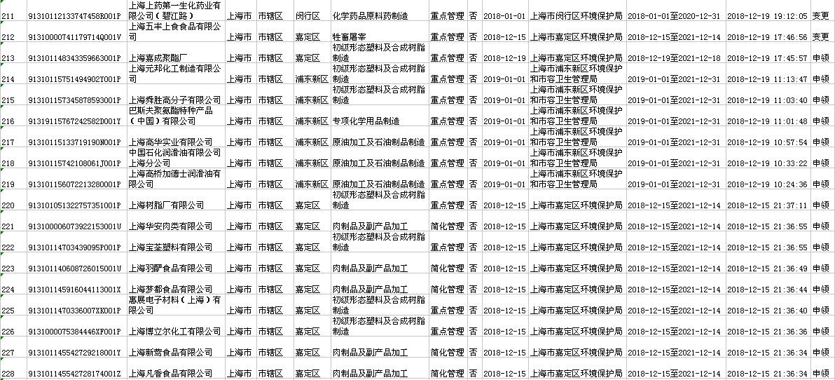 近日,上海市生態(tài)環(huán)境局發(fā)布了上海市排污許可證庫(截止2019年1月24日),匯總了475家具有排污許可證的企業(yè),詳情如下: