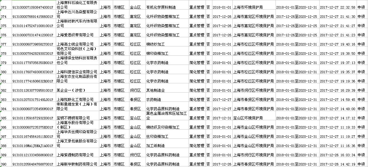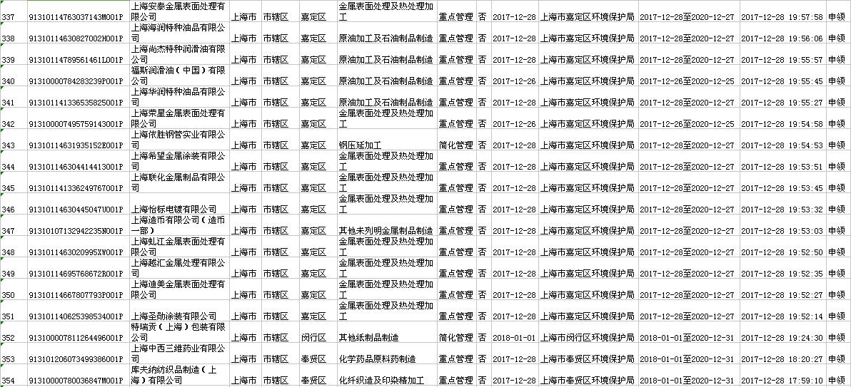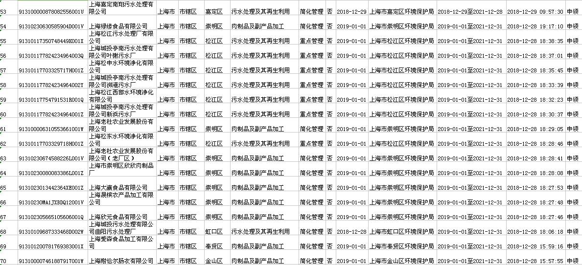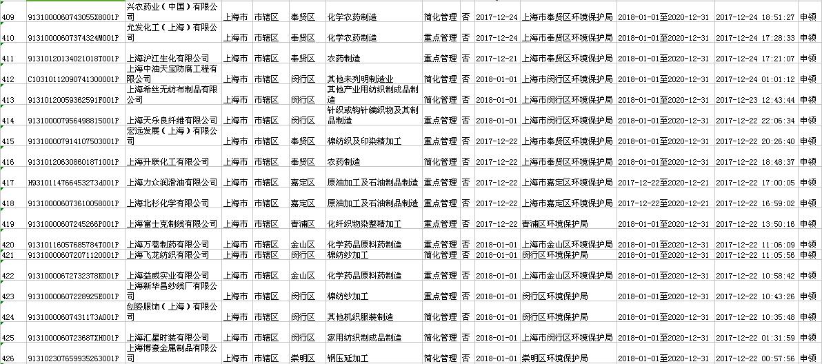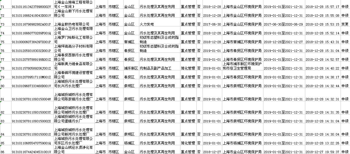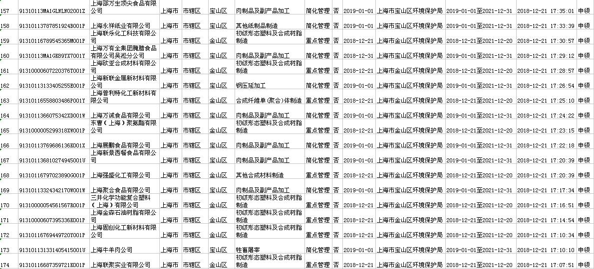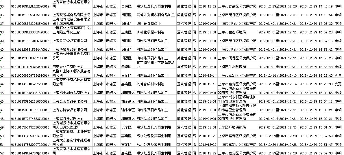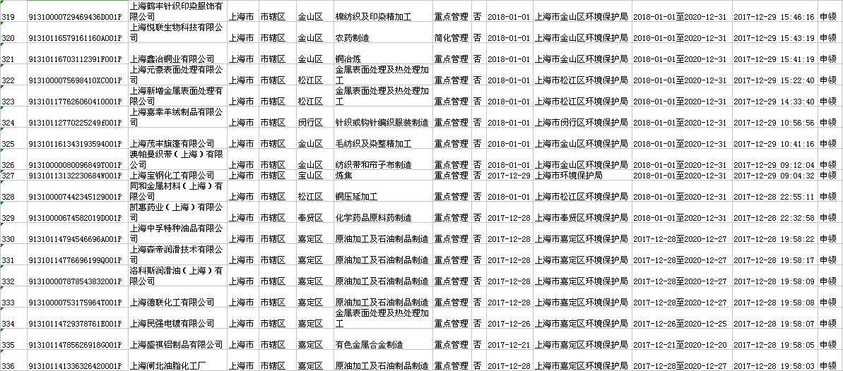 近日,上海市生態(tài)環(huán)境局發(fā)布了上海市排污許可證庫(截止2019年1月24日),匯總了475家具有排污許可證的企業(yè),詳情如下: