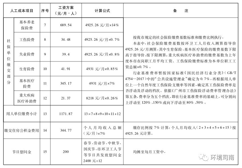 (二)環(huán)衛(wèi)用工成本指導(dǎo)價包括基礎(chǔ)工資、環(huán)衛(wèi)崗位津貼、環(huán)衛(wèi)工人工齡工資、高溫津貼、加班或者延長工作時間工資、國家法定節(jié)日和市環(huán)衛(wèi)工人節(jié)慰問金、社會保險(單位繳納部分)、住房公積金(單位繳納部分)8個部分,其他項目按照現(xiàn)有的法律、法規(guī)執(zhí)行。