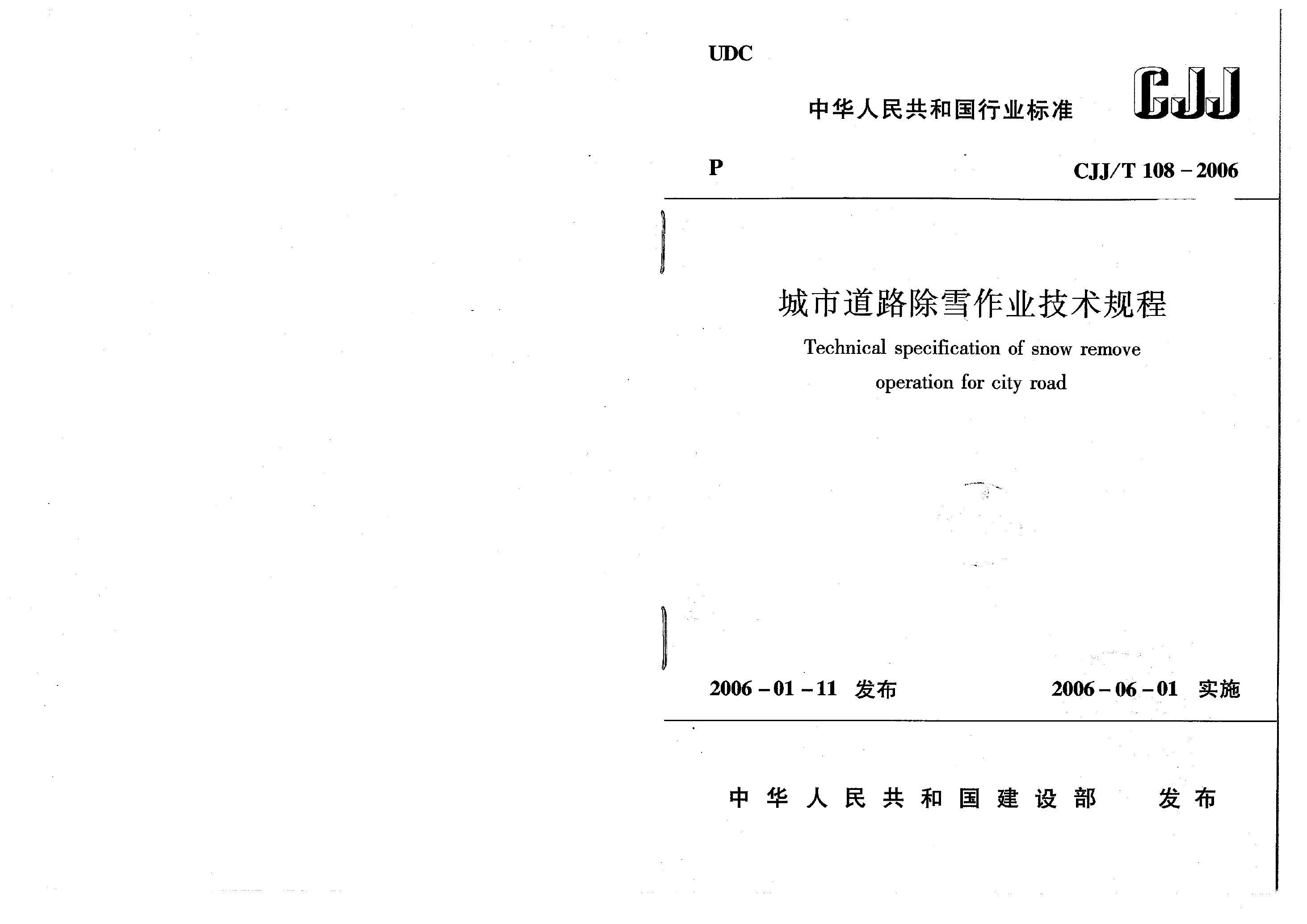 城市道路除雪作業(yè)技術(shù)規(guī)程(CJJ/T 108-2006)