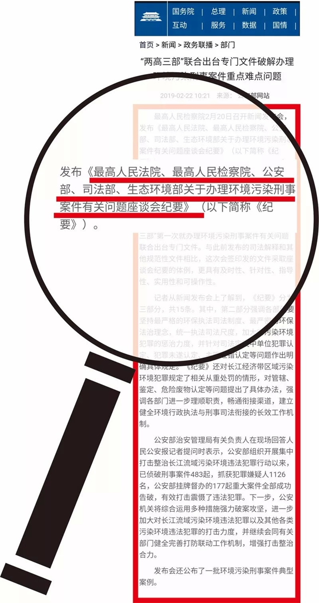 本月20日,“五大部門”,即最高人民法院、最高人民檢察院、公安部、司法部、生態(tài)環(huán)境部聯(lián)合發(fā)布了《關于辦理環(huán)境污染刑事案件有關問題座談會紀要》,明確了十一項當前辦理環(huán)境污染刑事案件中的重點難點問題判定,強調(diào)了各部門“要堅持最嚴格的環(huán)保司法制度、最嚴密的環(huán)保法治理念,統(tǒng)一執(zhí)法司法尺度,加大對環(huán)境污染犯罪的懲治力度。”其中特別指出:對重污染天氣預警期間,違反國家規(guī)定,超標排放二氧化硫、氮氧化物,受過行政處罰后又實施上述行為或者具有其他嚴重情節(jié)的,按照“兩高三部” 《關于辦理環(huán)境污染刑事案件有關問題座談會紀要》,可以污染環(huán)境罪追究刑事責任。認定單位犯罪時,要區(qū)分“直接負責的主管人員”和“其他直接責任人員”,重點打擊出資者、經(jīng)營者和主要獲利者。對于情節(jié)惡劣、社會反映強烈的環(huán)境污染犯罪,“不得適用緩刑、免予刑事處罰”!