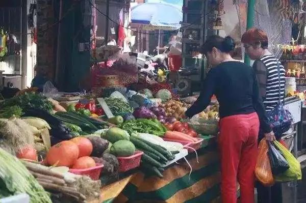 菜市場內(nèi),消費(fèi)者拎著五顏六色的塑料袋在買菜。