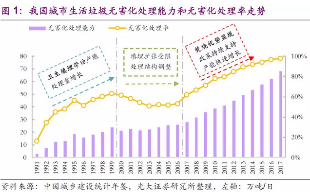 衛(wèi)生填埋技術(shù)在固廢行業(yè)發(fā)展初期帶動無害化處理能力的提升。我國固廢行業(yè)的發(fā)展是伴隨著城鎮(zhèn)化率提升、個人消費的需求而起的。行業(yè)發(fā)展初期(2000年前),無害化處理技術(shù)相對落后,投資有限,衛(wèi)生填埋技術(shù)憑借其適用范圍廣、技術(shù)簡單、單位投資和處理成本相對較低的優(yōu)勢,在這個時期引領(lǐng)了行業(yè)的發(fā)展。
