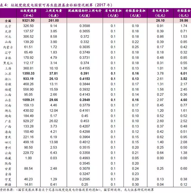根據(jù)全國城鄉(xiāng)統(tǒng)計年鑒的數(shù)據(jù),2017年全國城鎮(zhèn)垃圾焚燒處理量達(dá)9321.50萬噸。根據(jù)《國家發(fā)展改革委關(guān)于完善垃圾焚燒發(fā)電價格政策的通知》的補(bǔ)貼要求,每噸入廠生活垃圾折算上網(wǎng)電量假定為280度,計算得出全國垃圾焚燒上網(wǎng)發(fā)電量為261億度。進(jìn)一步根據(jù)各省市脫硫燃煤標(biāo)桿上網(wǎng)電價,以及分?jǐn)傊贫纫?,假設(shè)全國所有垃圾焚燒項目均滿足國補(bǔ)要求并納入可再生能源基金補(bǔ)貼目錄(實際的入庫率約為51%),測算得出2017年垃圾焚燒行業(yè)需要的國家可再生能源基金補(bǔ)貼總額為39.86億元(各省電網(wǎng)負(fù)擔(dān)26.10億元),僅占2017年可再生能源基金實際支出(712.06億元)的5.60%。