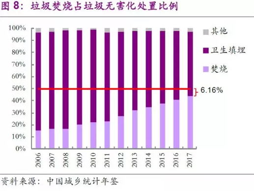 我國垃圾焚燒行業(yè)從“十二五”期間起快速發(fā)展,全國城鎮(zhèn)(設(shè)市+縣城)生活垃圾焚燒處理能力從2010年的8.9萬噸/日增長到2015年的23.5萬噸/日,再到2017年的33.14萬噸/日,每年的設(shè)市城市生活垃圾焚燒處置能力占無害化處理能力比例也從2010年的21.91%提升到2017年的43.84%,但是上述兩個指標(biāo)與“十三五”規(guī)劃的要求均存在一定差距(“十三五”規(guī)劃要求2020年需完成的指標(biāo)分別為59.14萬噸/日和50%),所以未來兩年仍需完成不小的垃圾焚燒處理設(shè)施建設(shè)任務(wù)。