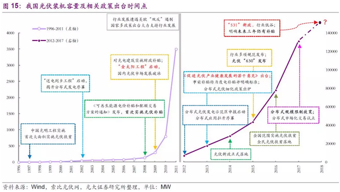 和新能源汽車行業(yè)類似,我國光伏行業(yè)的高速發(fā)展同樣離不開政府政策的大力支持和財政補(bǔ)貼的持續(xù)幫助。我國光伏裝機(jī)容量的高增速起點便是2008年《2008年7月~12月可再生能源電價補(bǔ)貼和配額交易方案的通知》的發(fā)布,首次實施光伏補(bǔ)貼。2012年我國遭遇美歐“雙反”政策后,國家持續(xù)出臺多項政策和補(bǔ)貼細(xì)則支持光伏行業(yè)的發(fā)展,帶動我國新增光伏裝機(jī)容量自2013年起連續(xù)五年位居全球第一,2017年光伏裝機(jī)容量已達(dá)131GW(全球第一)。